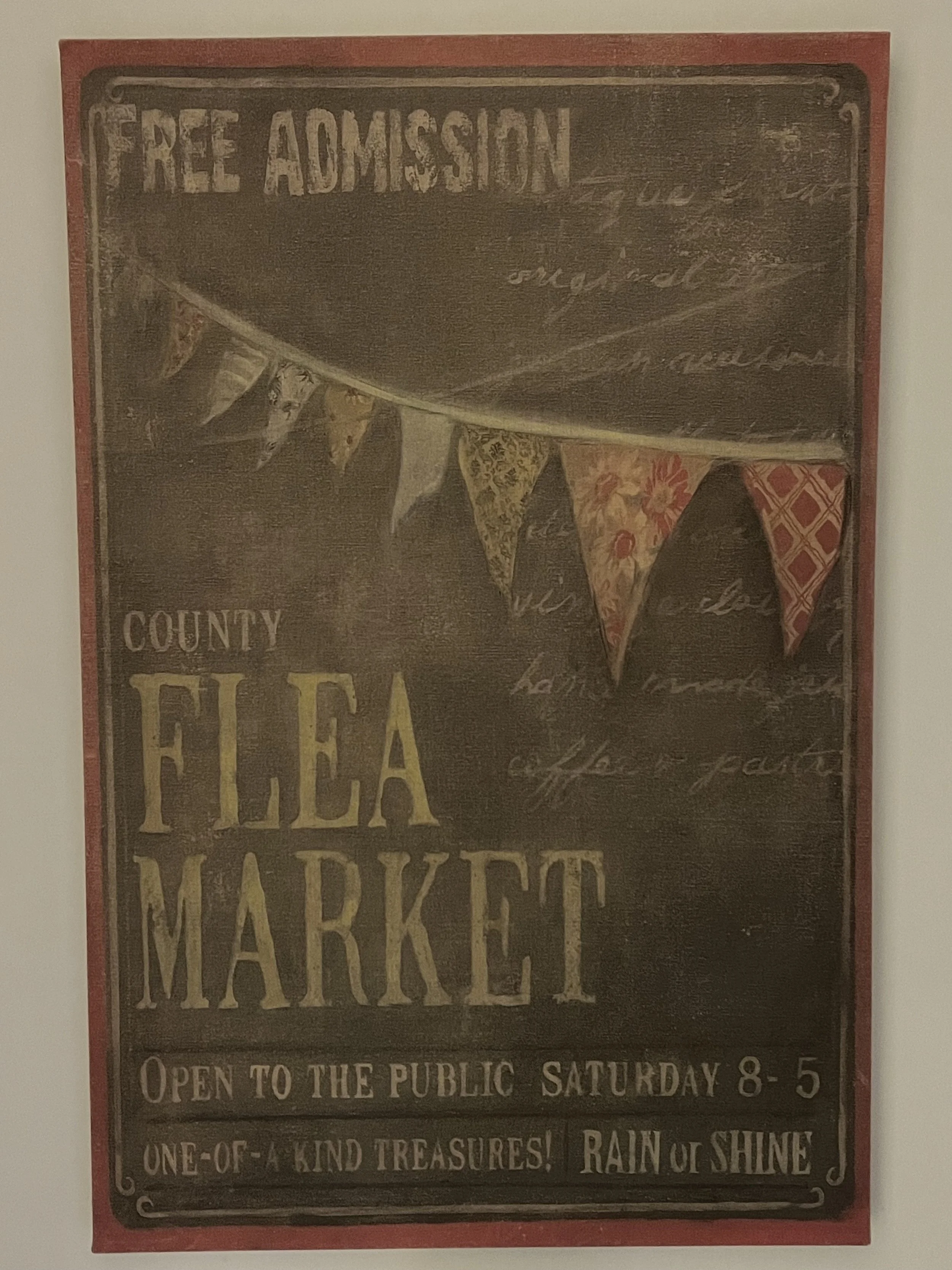 On weekends, my mom and grandma visited antique stores, flea markets and garage sales. I always tagged along and searched for tiny furniture and decorations for my dollhouse. To this day, I still gravitate to tiny trinkets. I’m also consistently drawn to art and old signs that nod or give ode to flea markets and antique malls. Take this painted cloth canvas I found at a local antique mall for $30 that now hangs in my bathroom. (I saw this same exact same piece of art in Black Mountain, North Carolina priced at $75, so I suspect I got a deal!)