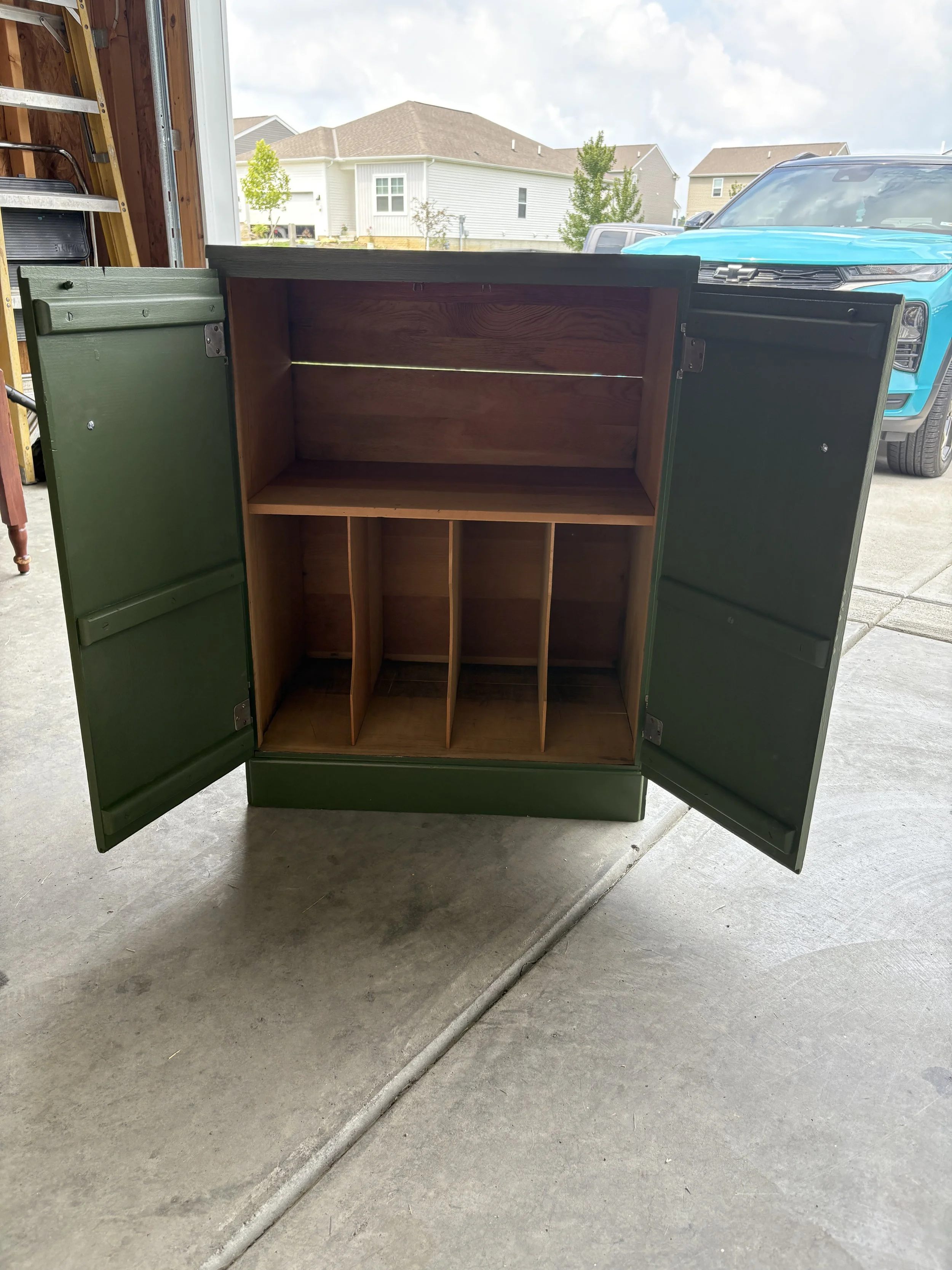A worn-out cabinet on a university porch caught my eye with its missing knob and hidden compartments. After a good clean, fresh green paint, and new brass hardware, it now feels playful and nostalgic—ready for a second life as a stylish home for vinyl records.